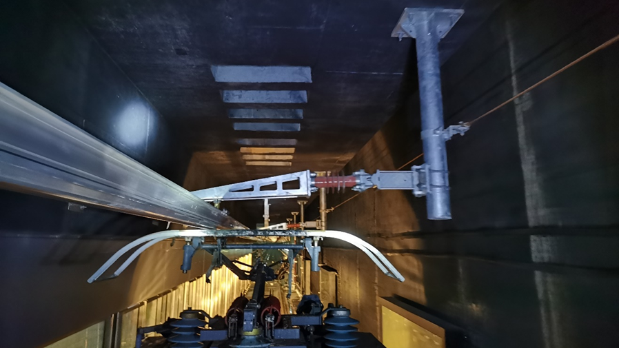 地铁列车能够穿梭于城市轨道交通线路网络,全靠电能驱动。城市轨道交通供电系统一般通过车站变电所将35kV交流电转换为1500V直流电后,通过安装于隧道侧下方的接触轨系统或安装于隧道顶部的接触网系统给列车供电。城市轨道交通的接触网一般采用汇流排+接触线的型式,汇流排通过悬挂装置固定在隧道上方,接触线安装在汇流排的底部凹槽内,列车通过顶部受电弓与接触线接触获取电能。相对于铁路工程悬挂接触线的方式而言,这种安装形式具有高强度和坚固的特点,因此这种方式又称之为刚性悬挂式接触网,武汉市轨道交通6号线和19号线的地下区间即采用刚性悬挂式接触网。