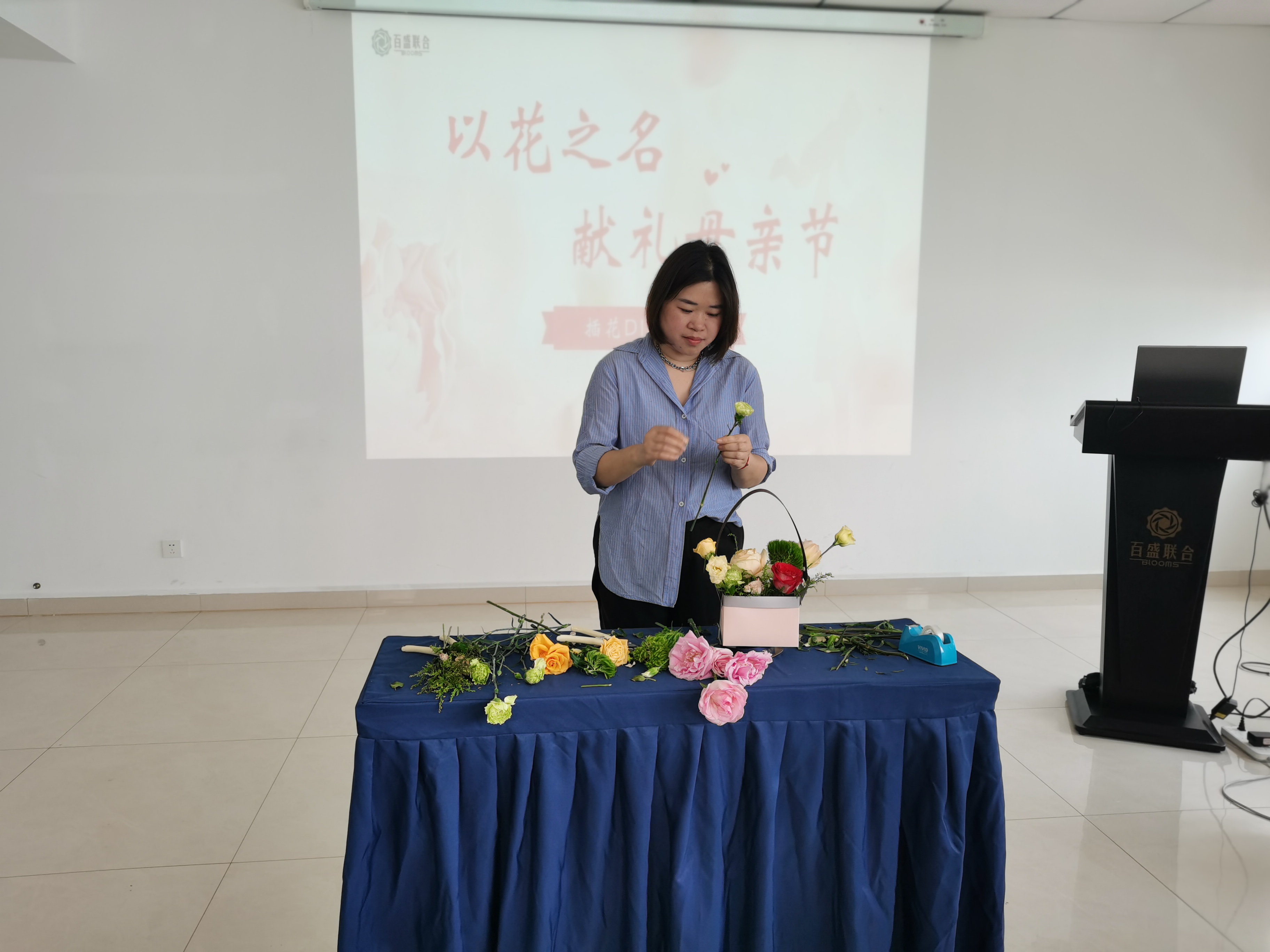 活动中,花艺老师从花枝修剪、造型搭配以及后续养护的注意要领等方面进行了详细的讲解,强调了插花的操作技巧,并现场进行了演示。