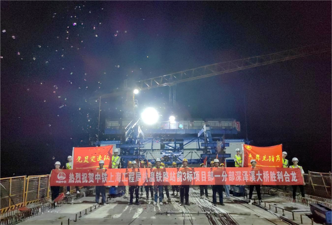 据悉,深泽溪大桥全长209.5米,由中铁上海局杭温3标项目一分部承建,采用挂篮悬臂式浇筑方式,严格把控梁体线形与应力,确保合龙前两悬臂相对高差在1厘米以内。由于大桥连接小岭隧道及仰头隧道,跨越S218、S219省道、深泽溪及人行步道。针对施工区域来往车辆、人流密集、安全风险较高的情况,项目部积极与当地交管部门联系,临时封闭人行步道,并在跨省道区域设置交通引导警示牌,为施工开辟绿色通道。同时,安排管理人员对施工全过程进行旁站监督,并多次组织安全教育培训,在大型模板吊装、0#块施工、挂篮行走等关键工序进行班前安全、技术交底,保证安全质量可控。