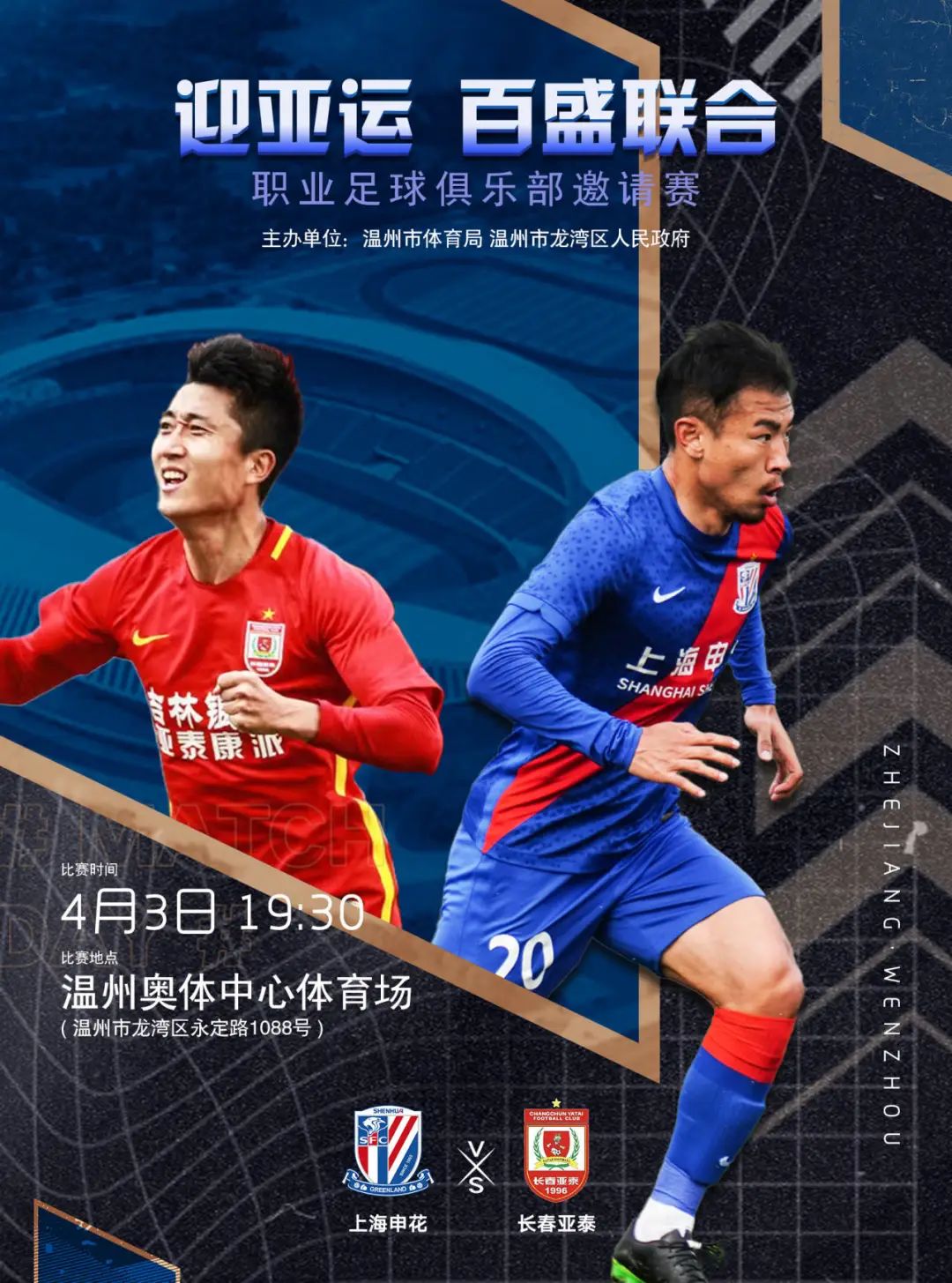 杭州亚运会将于2023年9月23日至10月8日举办。届时,温州奥体中心体育场将承接杭州亚运会足球赛事。为做好亚运足球赛事的筹备工作,4月3日和4月7日,四支中超球队上海申花足球俱乐部、长春亚泰足球俱乐部、北京国安足球俱乐部和南通支云足球俱乐部,将在温州奥体中心体育场两两对决,进行亚运足球测试赛。
