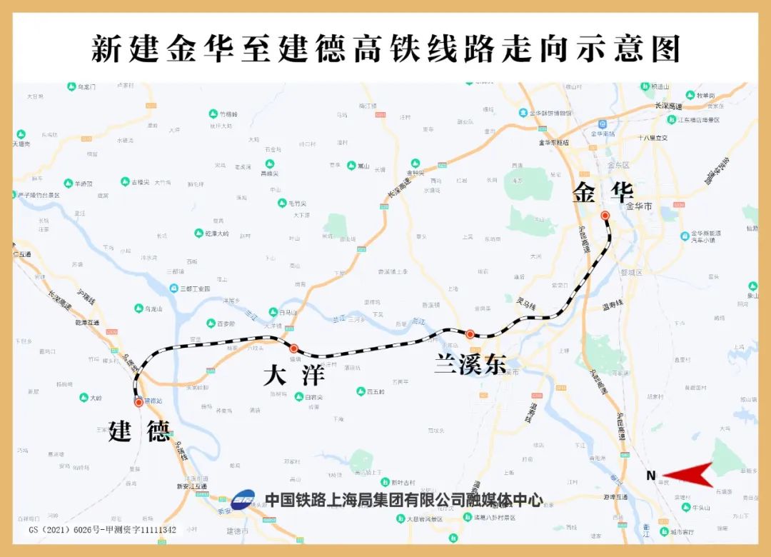 金建高铁全长64.51公里,是设计时速为250公里的双线铁路。线路自既有金华站引出,向北经兰溪市、建德市,在建德站接入杭黄高铁,沿线设金华、兰溪东、大洋、建德等4座车站,其中兰溪东站和大洋站为新建车站。