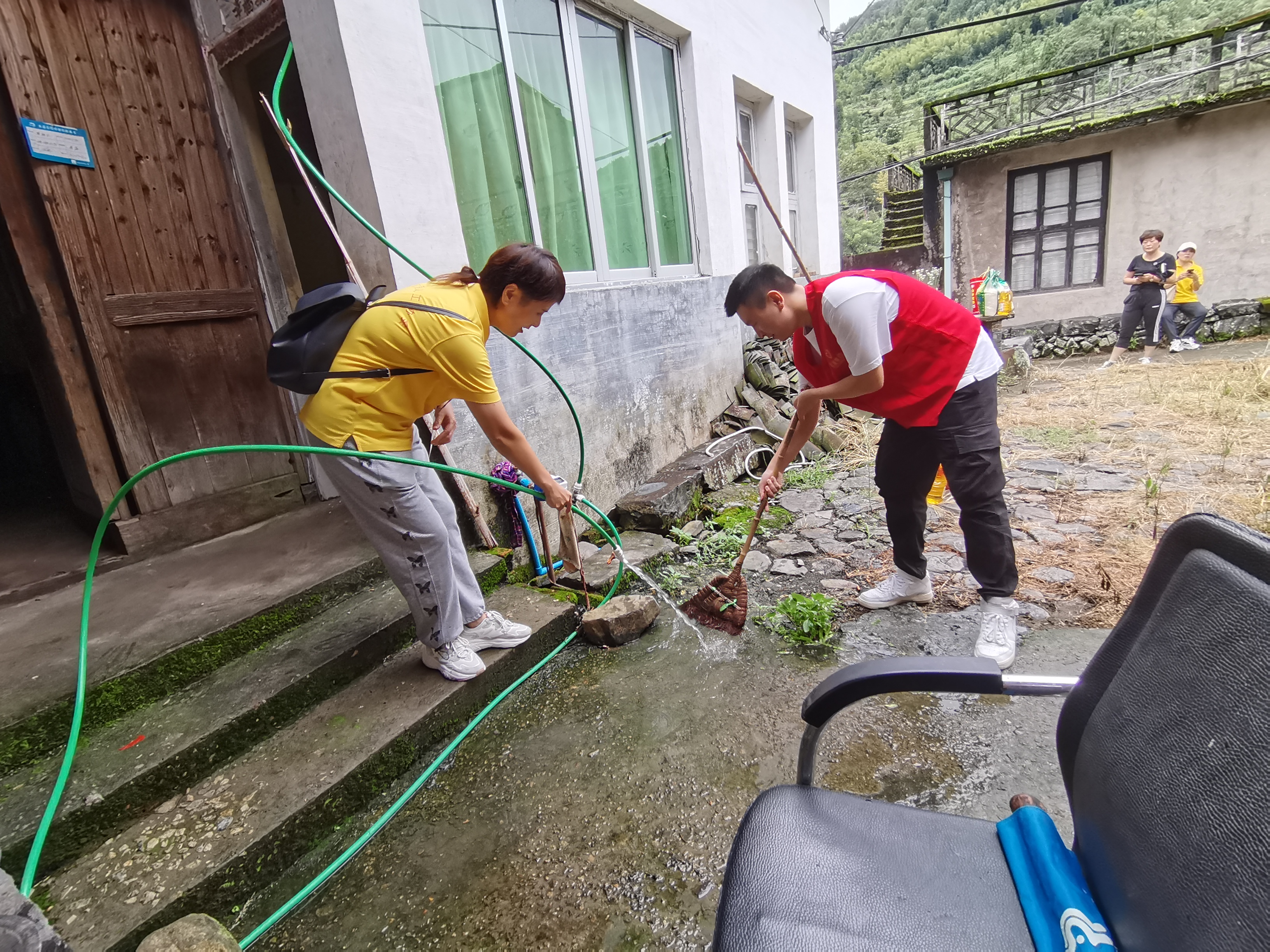 今年八十八岁的潘锦同与潘锦水,是相差六岁的兄弟。两人结伴居住在一个老式房屋,大厅里还养着鸭子、兔子等家禽。走进庭院,志愿者看到兄弟俩房间门口的台阶下已布满了青苔,担心老人走过滑倒,手拿着扫帚和水管用力冲刷着,做到最大程度的清除。哥哥潘锦同腿脚不便,在志愿者的搀扶下,一步一步的走出房前。时光只解催人老,看到志愿者的到来,老人的精神依然神采奕奕。