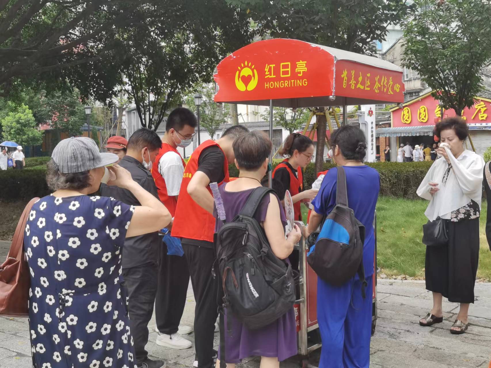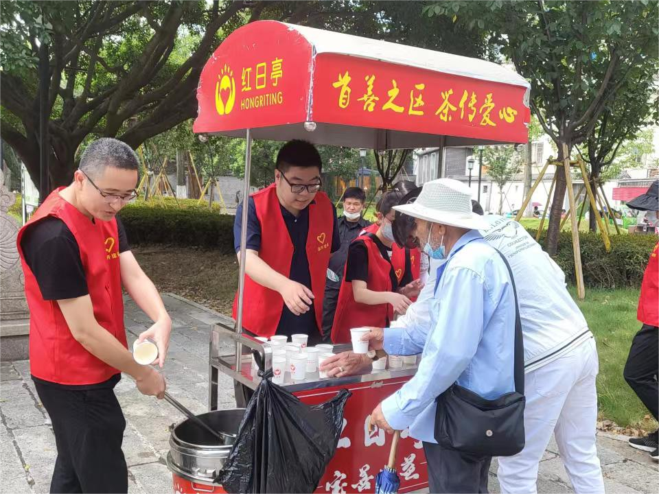 一棵大榕树,一座红日亭——温州的“道德地标”。7月27日上午,志愿者们赴“红日亭”开展“炎夏送清凉 茯茶解酷暑”志愿活动。