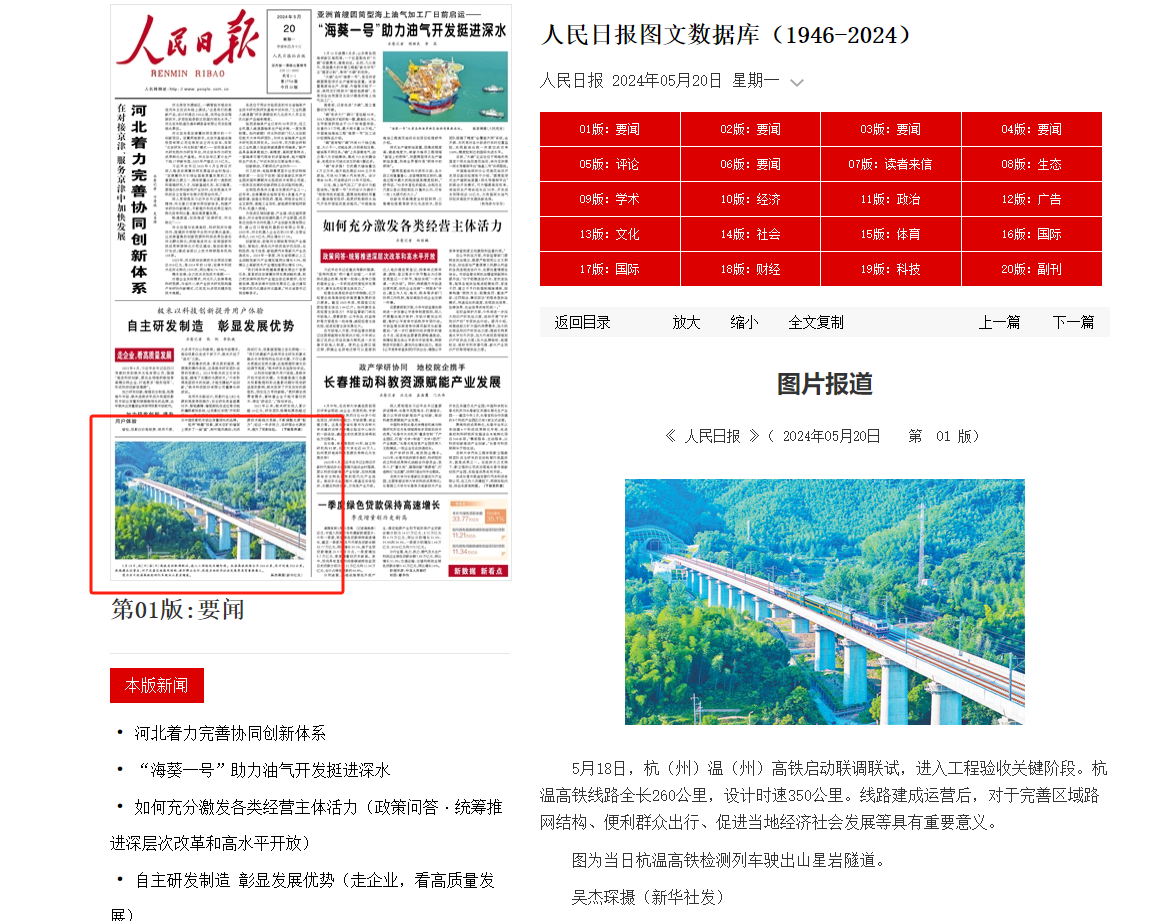 5月20日,《人民日报》头版刊发图片报道。报道指出,杭温高铁线路建成运营后,对于完善区域路网结构、便利群众出行、促进当地经济社会发展等具有重要意义。