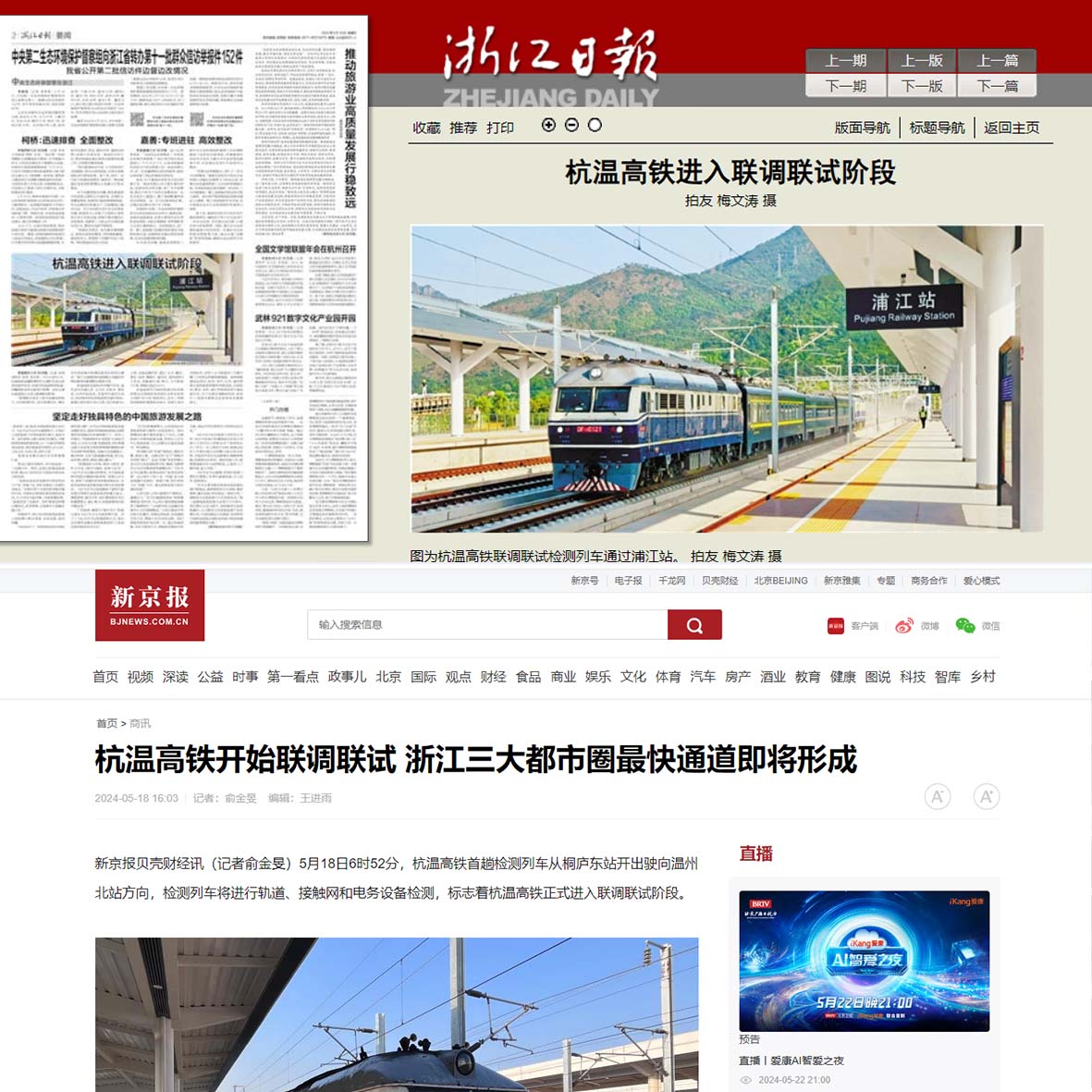 5月18日,中央广播电视总台《新闻联播》栏目播放报道《杭温高铁开始联调联试》。并指出,杭温高铁通车后,杭州、金华、温州等地将形成一小时交通圈。