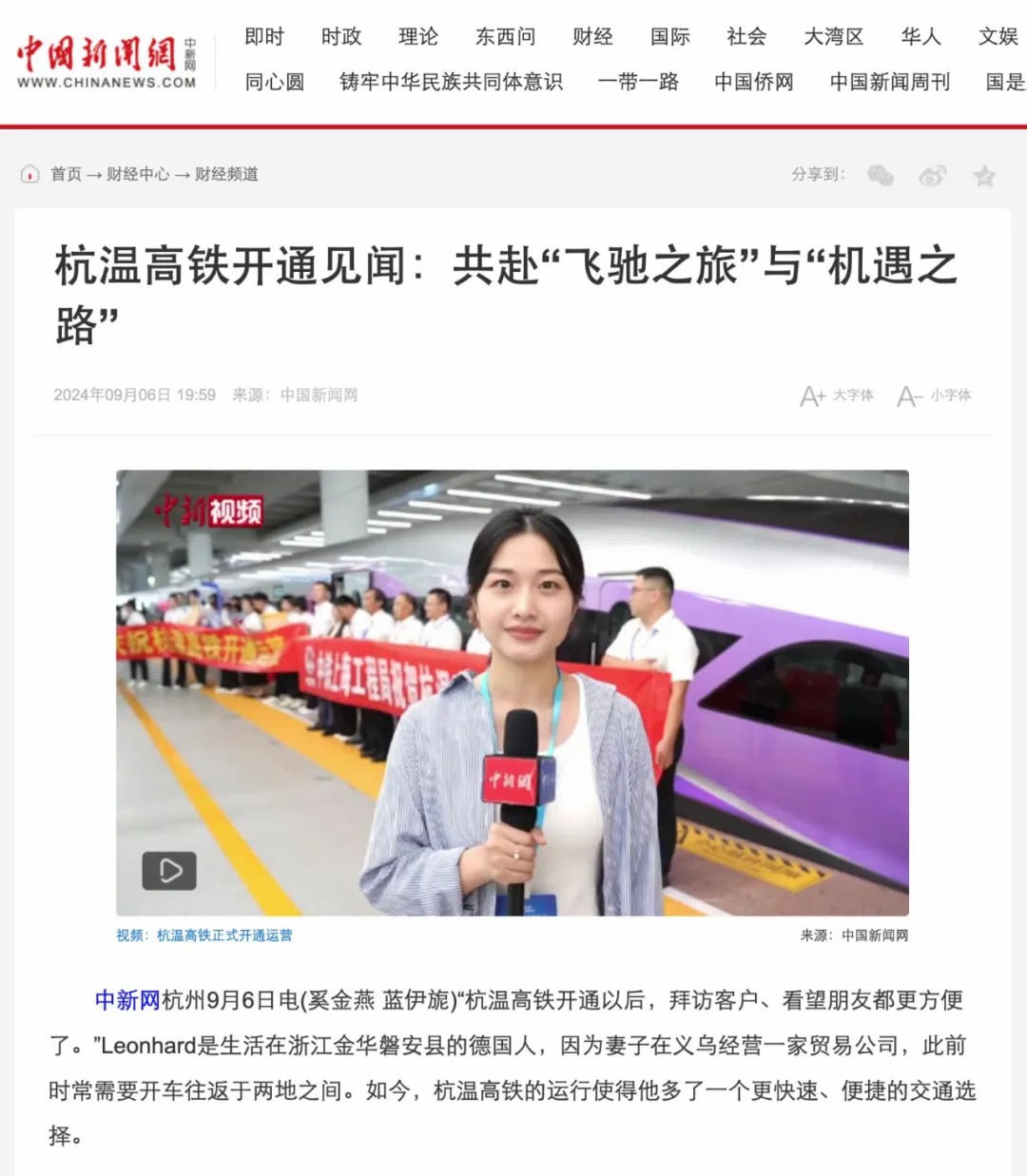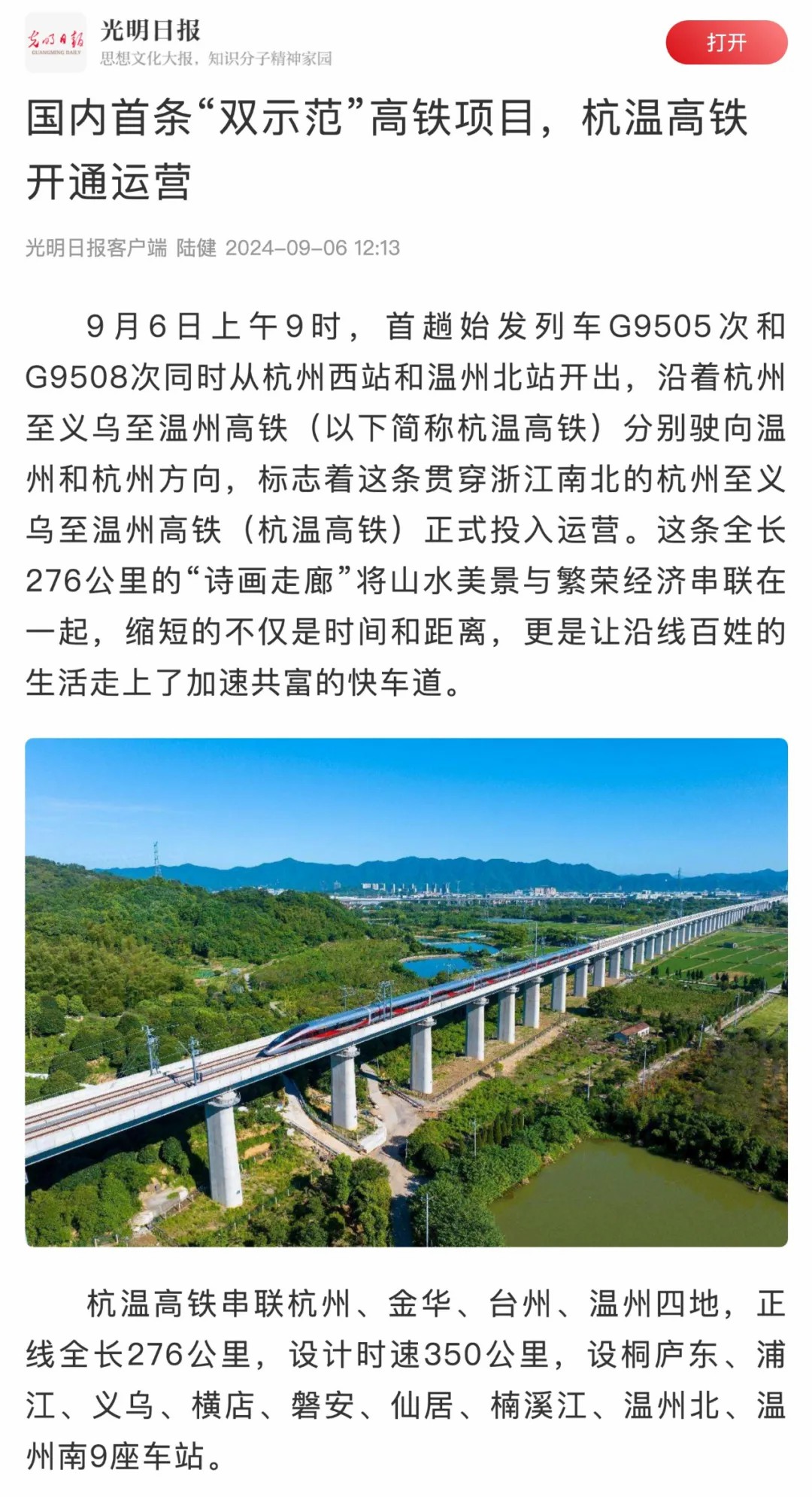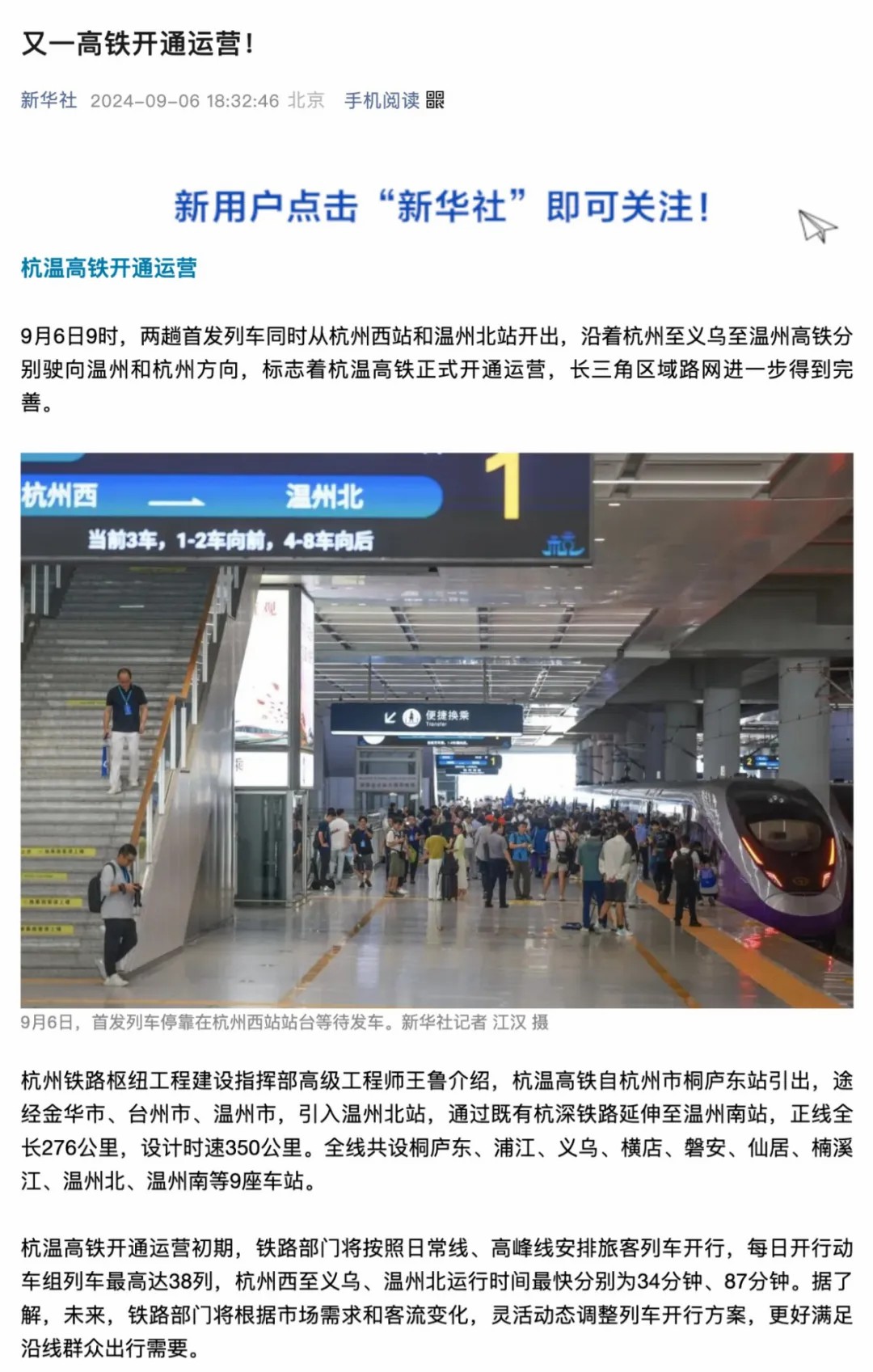 9月6日,随着首趟始发列车G9505次和G9508次,同时从杭州西站和温州北站开出,沿着杭温高铁分别驶向温州和杭州方向,标志着由betway88西汉姆联投资建设的杭温高铁正式开通运营。