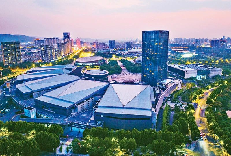义乌是民营经济大市,是浙江首个、全国第二个在册市场经营主体数量突破百万的县域,被誉为“世界小商品之都”。图为2024年10月9日拍摄的暮色下的义乌。 新华社记者 翁忻旸/摄