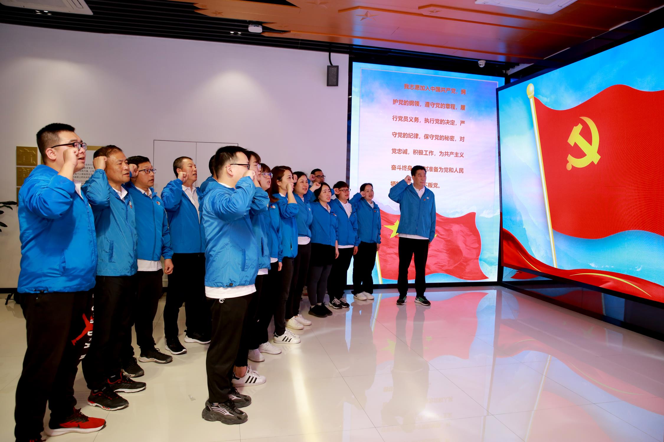 在宣誓厅中,全体党员面向党旗,举起右手庄严宣誓。一字一句掷地有声,重温入党初心。