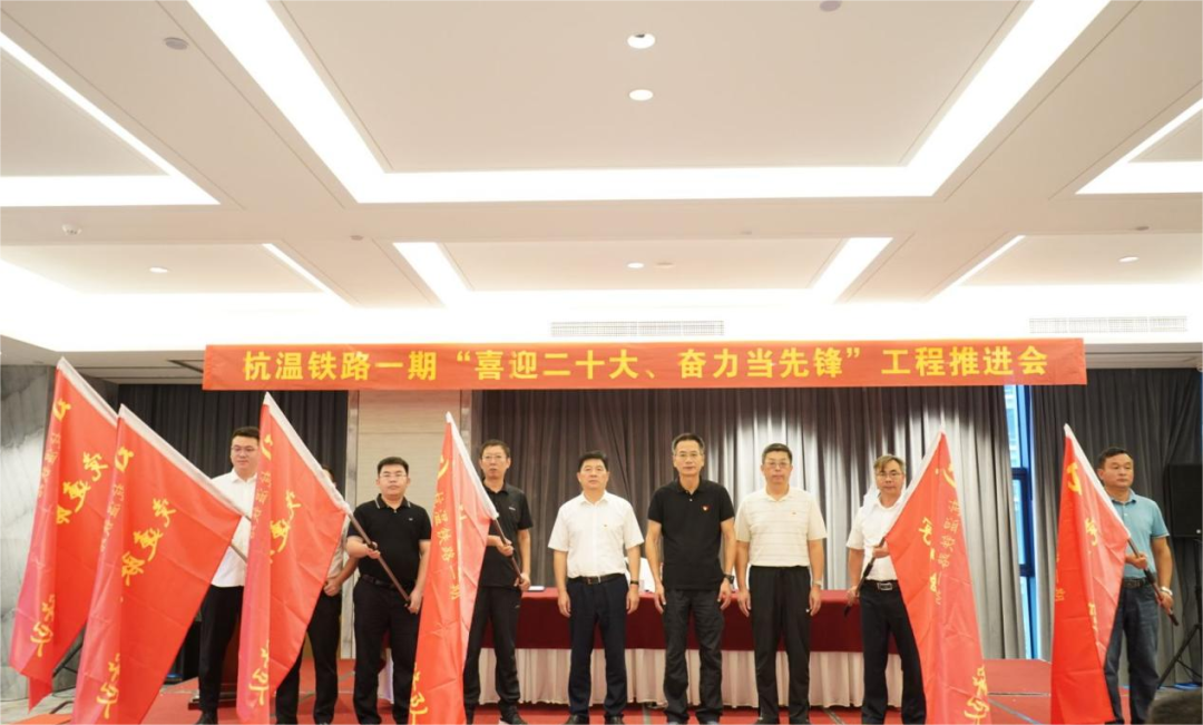 杭温指挥部书记陈圣明、副指挥陈平和杭温公司副总李久友向站房1标、2标、3标、4标以及四电标的通号、电气化局、信息标等7家施工单位授予“党建联创先锋队”旗帜,对他们的建设和党建工作表示充分肯定。各站后施工单位项目部经理表态发言,对“按照施组计划的安排,年底前实现全线基本贯通”的目标做出承诺。
