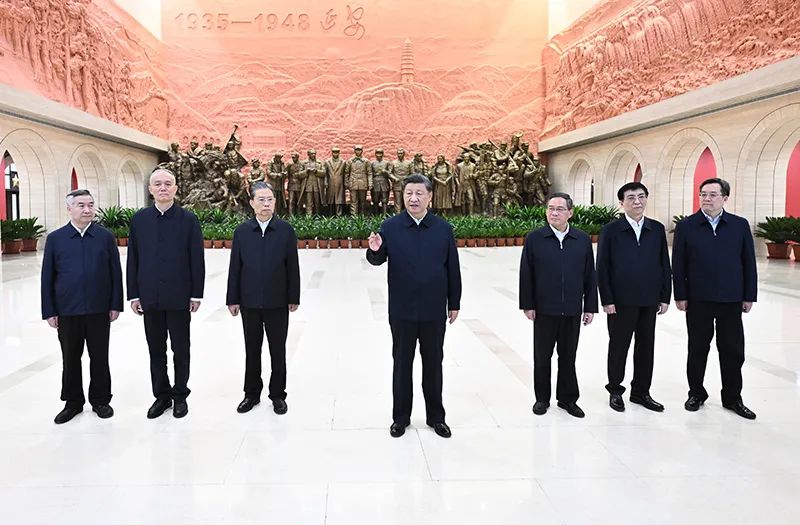 2022年10月27日,中共中央总书记、国家主席、中央军委主席习近平带领中共中央政治局常委李强、赵乐际、王沪宁、蔡奇、丁薛祥、李希,瞻仰延安革命纪念地。这是习近平在延安革命纪念馆参观《伟大历程——中共中央在延安十三年历史陈列》结束时发表重要讲话。 新华社记者 燕雁/摄