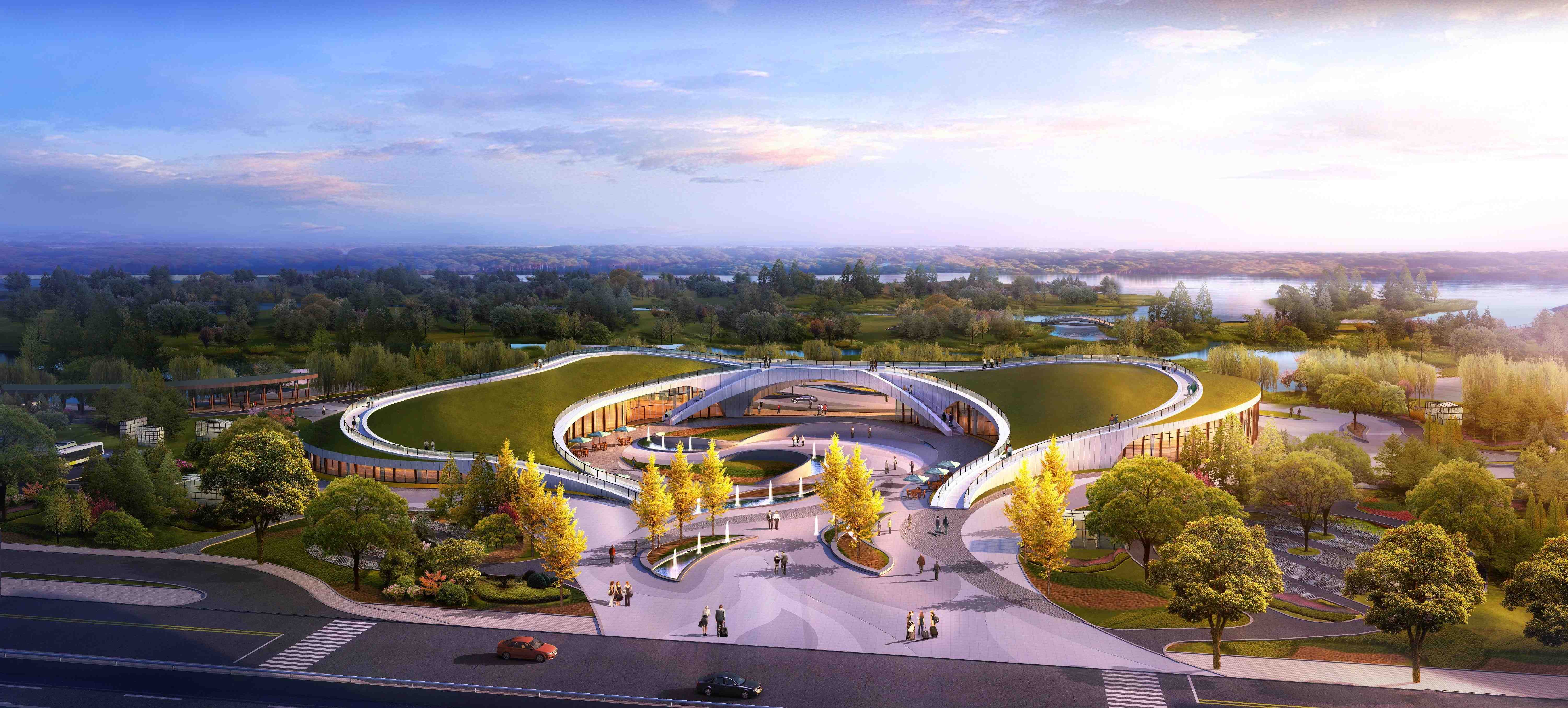 项目设计理念来源于三垟湿地三宝之一的“菱角”,地上建筑造型由东西两栋两层弧形主体外加中间钢结构天桥相连,营造出“双菱抱月”的景观效果。平台两侧种植了大量蒲苇,原生乡土气息浓郁。
