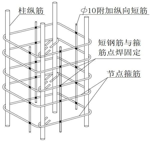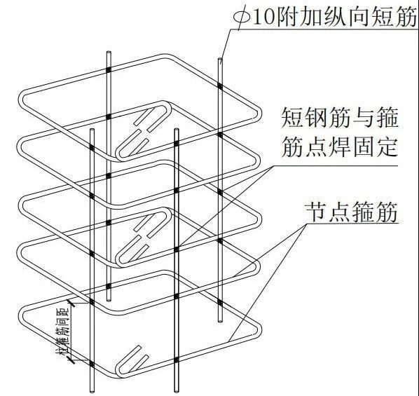 首先,根据施工图和下料清单,按每个梁柱节点水平箍筋的间隔尺寸和型式制作单个箍筋,然后,利用钢筋头加工形成纵向短筋。