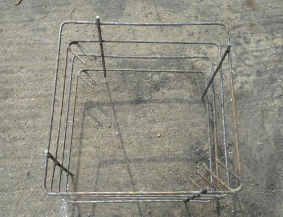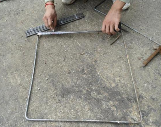 其次,根据图纸设计要求,将纵向短筋与箍筋按间距、位置焊接,得到柱箍筋骨架钢筋笼。
